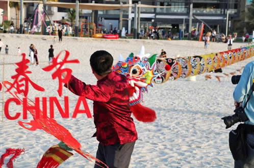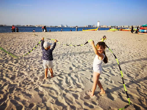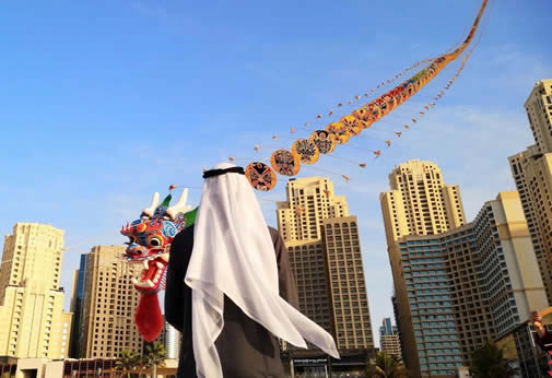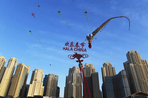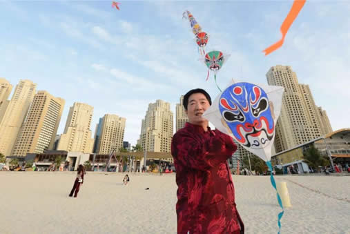 “璀璨中华”欢春团还在充实的快闪行程之余,来到轻松惬意的迪拜海滩“放飞祝福”。在来自北京的风筝技艺传承人赵铁民与赵子赫父子档带领下,欢春团成员共同将一条长达70米的巨龙风筝放飞,“中国龙”腾空而起飘扬在迪拜The Beach上空,为当地民众与游客带去来自中国的祝福,漫天的中国风筝成为当天阳光海滩上的一处盛景。