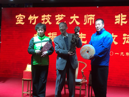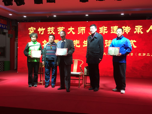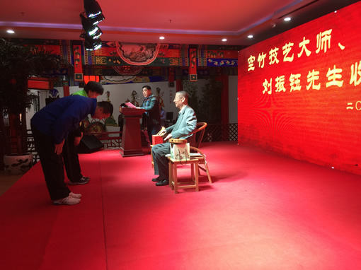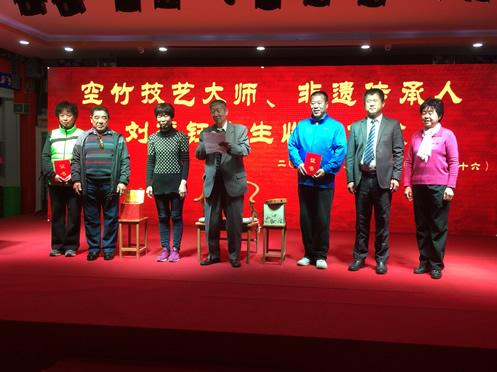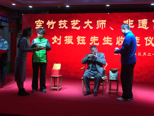 接着,刘振钰老师发表收徒感言。他说,今天,我有幸收下傅海山、贾月梅两个新弟子,心里很激动、很高兴。截止目前我已收下七名徒弟,他们都很优秀,同时也感到自己身上的责任和压力很大。刘老师承诺:一要把抖空竹的技艺毫无保留地传授给徒弟们,促进非物质文化遗产的发扬;二要在徒弟们遇到困难的时候,给以真诚的关心和帮助,培养他们敢于做事、敢于实践的能力;三传承空竹技艺,要精益求精,要广交朋友,要抓住机遇,让自己不断提高、不断进步。弟子傅海山表示:在今后的日子里,要同师哥、师姐一起传承师傅的空竹技艺,为弘扬普及民间民族传统体育项目抖空竹,做出自己的努力。