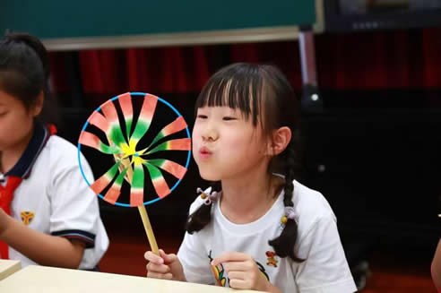 讲完风车的文化历史,到了孩子们最期待的动手制作环节。左手提溜着圈,右手掐着纸条的尖,绑线的头对着胳膊,从外往里顺时针粘一圈。在刘老师的耐心指点下,孩子们合作完成了风车的制作。看着手中一个个哗啦啦响的小风车,同学们纷纷表示:今天的时间过得太快了、太高兴了。