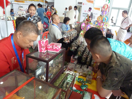 开幕式启动仪式还在进行,一对母子就来到北京玩具协会展区,这位母亲告诉太平燕王文运老师,她说:我们娘俩是在专门寻找民俗的有特色的玩意儿呢?太平燕、吉祥鼓,现在还有人做,真是太好了;自己的老父亲已经90多岁了,小的要玩,老的也要玩,买件礼品带回去可以勾起老人家童年的回忆。随父亲来玩博会参展的王秋欣小姑娘,今年10周岁,来自河北省衡水市,从开馆到闭馆我基本上都在北京玩具协会展区和大舞台这两个地方转着看,我最喜欢传统艺术、喜欢传统文化了,小姑娘纯情兴奋地说。这都是老北京的玩具,这风车看上去好酷;都是纯手工艺术、手工操作,真是佩服;一位老者说,来到玩博会,就想看毛猴;年年富裕、年年有鱼(余),这面塑做的好讲究啊!给爷爷鼓掌;这翻花咱家有,翻花玩哪个、教哪个,不一样的玩法,翻花孙奶奶正在向大家做介绍……玩博会上观众们看到这些既民俗又特色,其中还有故事的民间玩意儿,兴趣大增,赞叹不己。