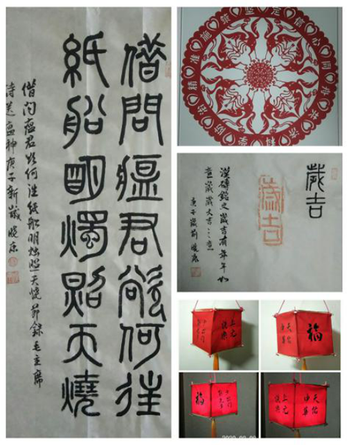 两个多月没出家门,手边的东西,就成了我创作的原材料。垫花盆的半块灰砖,用刻刀凿刻出了仿汉砖纹样“歲吉”,再把它传拓在宣纸上,毛笔写下了我对新一年的祈福。把中国传统文化中的传说四大圣兽之一,具有烈焰之力的朱雀飞降湖北,驱瘟灭疫的场面画在纸上并剪出了《万众一心抗疫必胜》的团花剪纸,几双废弃的筷子、一张红纸做成的灯笼上面写着“少出门、勤洗手”,“天佑中华”等就成了上元节的装饰。