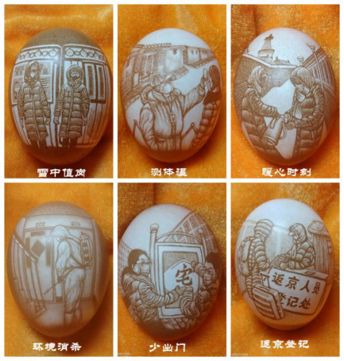 每天将近10个小时的创作,用了将近一个半月的时间,一套6件《防疫在社区》的蛋雕作品终于诞生了。“雪中值岗”、“测体温”、“暖心时刻”、“环境消杀”、“少出门”、“返京登记”,我用手中的刻刀在蛋壳上,留下了社区工作者在抗疫阻击战中的英雄谱。