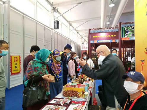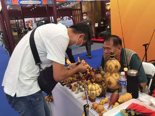 服贸会既高大上也接地气。康驹祥老师的葫芦手工艺品受到前来参展观众的青睐,这些葫芦作品色彩鲜艳、造型各异、做工精制,人们纷纷驻足观赏、拍照,更有许多观众在询问价格,想买回家作为留念。