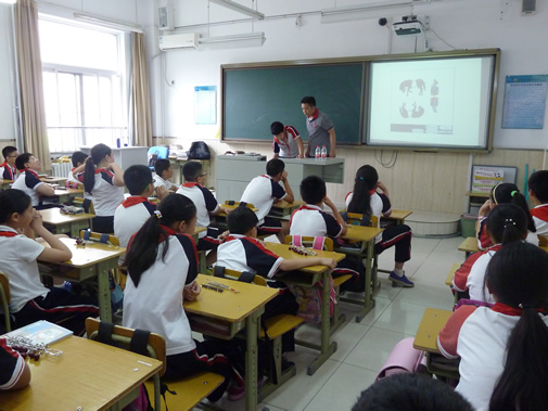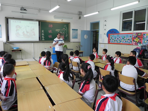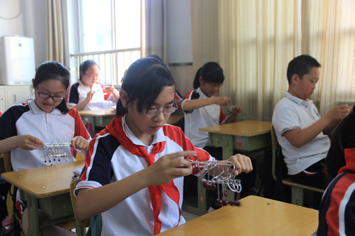 教学楼五1班教室内,传统益智游戏九连环是由一位年轻的益智玩具爱好者武元元老师给大家辅导上课。作为新生代的佼佼者,元元老师运用先进的现代化教学模式,立刻和孩子们打成一片,有的在投影仪跟前作演示,有的走上讲台做道具,板书、玩具融为一体,同学们在学中玩,玩中学。