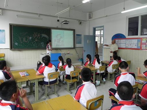 “非遗”专家、中国万花筒第一人李鸿宽老师李老,风趣幽默、和蔼可亲,正在六3班教室授课。课堂上,他给师生们展示了不同风格、多种各样的万花筒教具,光学、物理学、数学等众多知识,时不时还用英语与大家互动,斑澜多彩的梦幻世界让同学们受益匪浅。