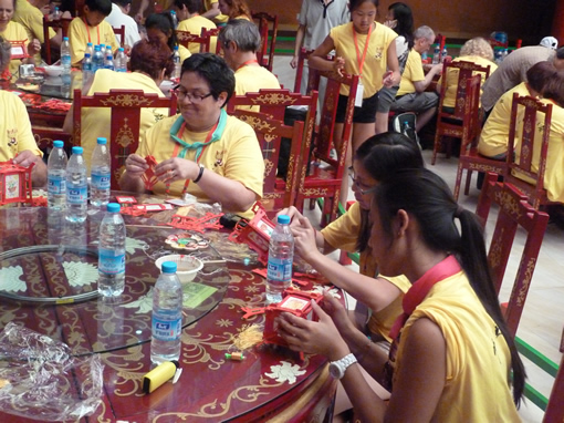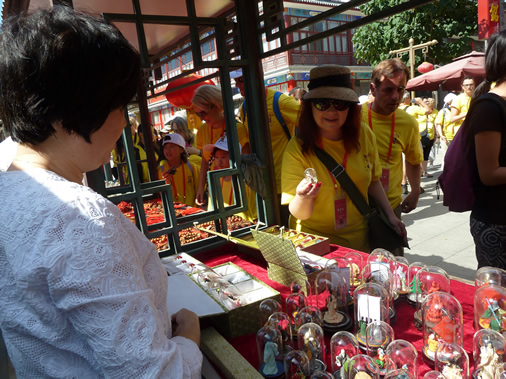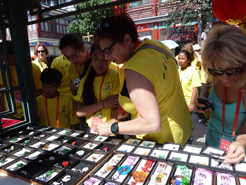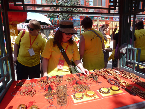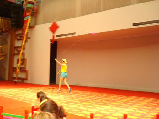 料器、面人、核桃、毛猴、耍货、风筝、绒花、编结、空竹等门类组成一道亮丽的风景线,重归故里的孩子和他们的“洋父母”迈进大门,就被这些浓厚的中国传统文化所深深吸引。百丑迎宾老艺术家的精彩亮相,上下飞舞抖动的空竹……让人目不暇接、流连忘返。