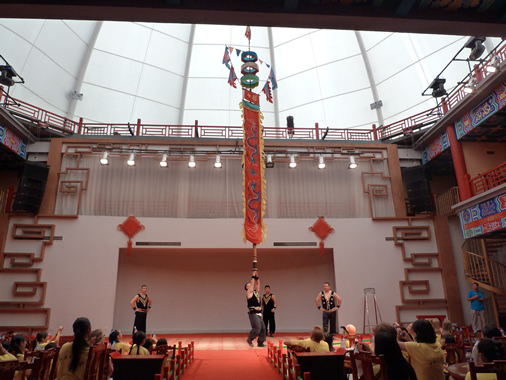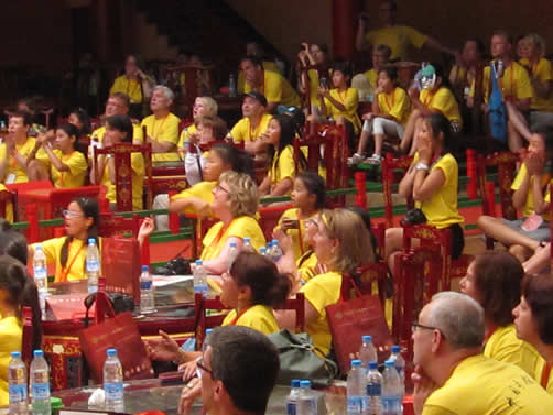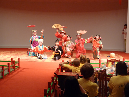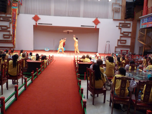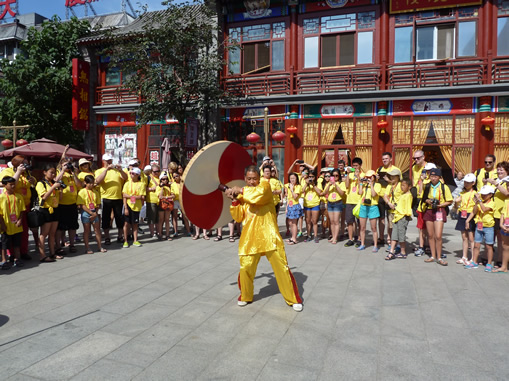 演出开始,首先由平均年龄为60多岁的老艺术家们奉上的《百丑迎宾》拉开序幕,他们欢快滑稽的表演引来阵阵笑声。直径达1.4米、1米和50公分长的大空竹和川剧变脸表演,让营员们再一次领略到民间艺术的魅力。中幡、耍大刀和开五张弓高难度的演出,营员们不时爆以掌声、欢呼声,现场气氛高潮迭起。