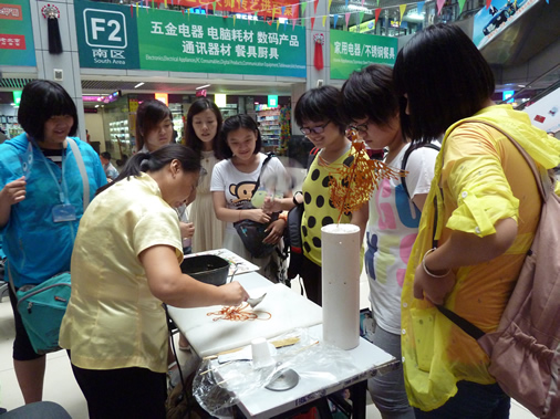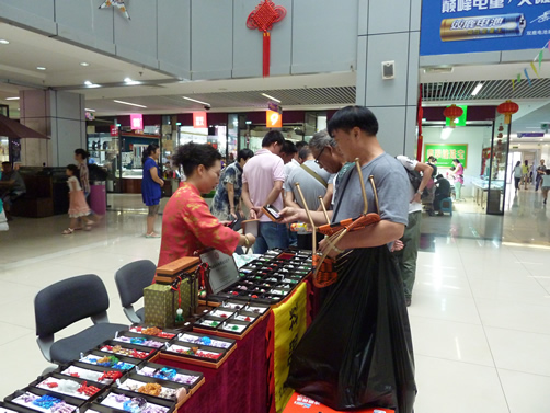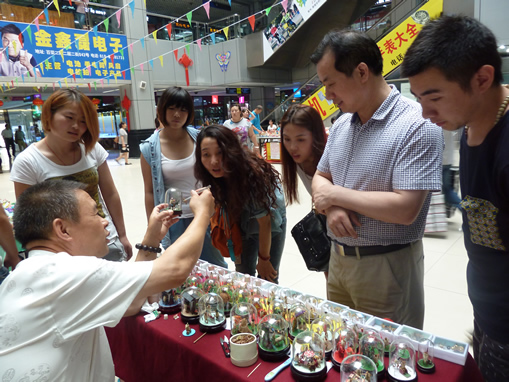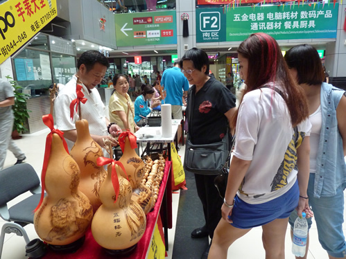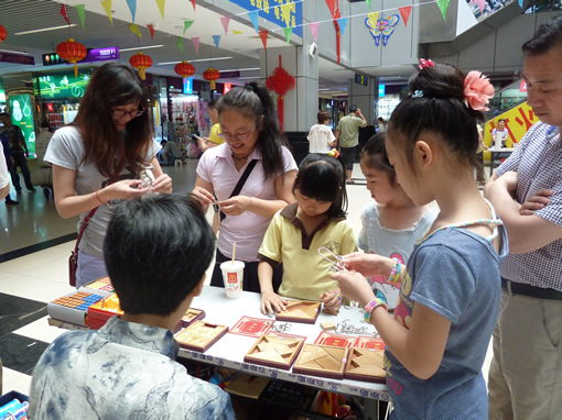 商城二期南中厅红灯高挂,彩旗飘扬,风筝飞舞,人头攒动。葫芦工艺、核桃工艺、内画、糖画、绒花、脸谱、毛猴、蜡果、兔爷、编结、珠编、面塑、皮影、料器、益智玩具等十几个门类20多位的老北京民间工艺大师现场献艺,给前来参加活动的孩子、家长、顾客奉上了第一道传统文化的大餐。