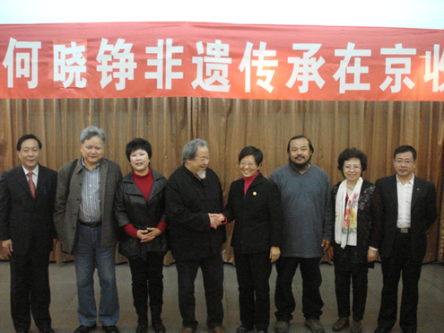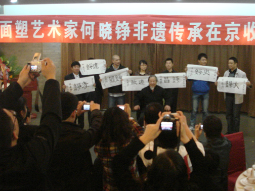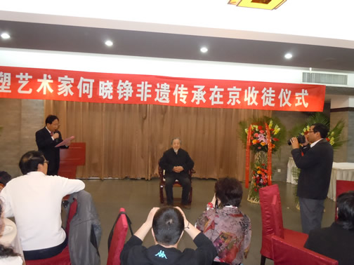 著名山东面塑艺术家何晓铮2011年4月23日在北京西苑饭店举行了“非遗”传承在京收徒仪式。北京民间文艺家协会、北京玩具协会、北京工艺美术学会、山东省非遗保护中心民俗学会、山东面塑协会在京各个民间门类项目艺术家、在京学生三十余人到场祝贺。何晓铮老师已是七十多岁高龄,但是为了弘扬民族文化,为传承发展民间艺术不辞辛苦育人传艺,培养了一批批民间艺术继承人。为民间艺术做出很大贡献。