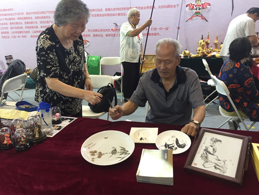 北京玩具协会组织的老北京民间工艺内画、绒花、葫芦工艺、太平燕、面塑、刻瓷、玲珑枕、毛猴、卵石画、手工布艺、风筝等十一个门类10余位民间工艺大师精彩献技,受到观众喜爱,现场气氛高涨,让人目不暇接,叹为观止。
