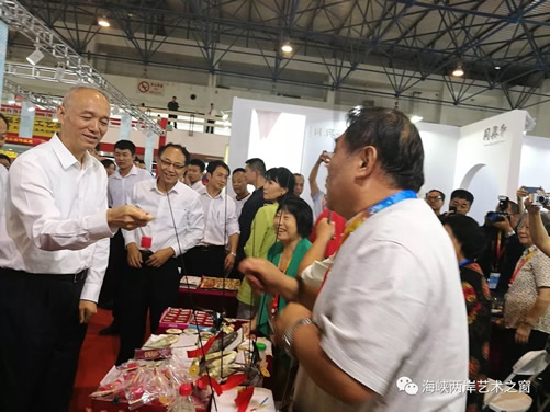 开幕当天,北京市委书记蔡奇在市委副书记、代市长陈吉宁,市委常委、宣传部部长杜飞进,全国工商联副主席、北京市副市长程红等领导的陪同下,莅临文博会现场视察并指导工作。当蔡奇书记来到北京玩具协会展区,亲眼目睹这么多的传统玩意儿时,他说:这是老北京的老物件,得好好传承。蔡奇书记还高兴地摇起了太平鼓,并与民间工艺大师亲切握手。