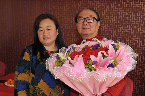 拜师仪式开始,杨老师和杨师母首先上台就座,弟子李爱红上前行拜师礼后,给师傅、师母敬茶,并向师傅敬献鲜花。杨老师勉励徒弟李爱红:“热爱中华文化,发杨工匠精神,继承面塑技艺。”这既是对徒弟的希望,也是对自己的鞭策,以此共勉。
