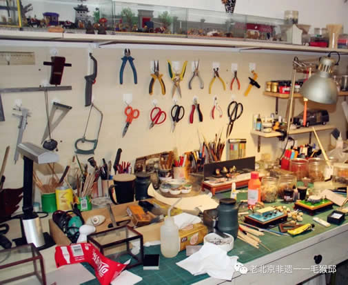 走进工作室,真的很让人感叹,一个小小的毛猴竟要用到这么多工具,在工作台上,剪子、钳子、刻刀、台钻、镊子、锤子一应俱全。