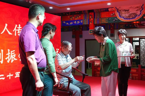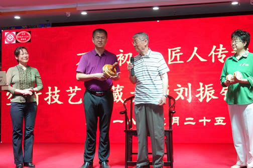 收徒仪式上,余志忠、谢桂香、贾秀杰成为刘振钰老师的新弟子。今天我又荣幸地以师傅身份,站在这里发言,这是玩具协会领导及各位同志对我的信任和肯定,能给充满活力的年轻人、空竹爱好者当师傅,是信任、是嘱托,是荣幸、更是责任,也是压力,更是义务……刘振钰老师说。他希望,他的爱徒们互相切蹉,取长补短,提升抖空竹技艺;增进交流,虚心求教,大胆创新,创造出一片新天地。一日为师,终身为父。三名学生向师傅奉茶,师徒互赠礼物,大弟子余志忠代表三位弟子发表了感言。