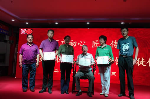协会副会长、秘书长钟伟,协会副会长、空竹玩具委员会主任张文良向刘振钰和余志忠、谢桂香、贾秀杰师徒四人颁发“传艺授业”和“求师问艺”见证证书。