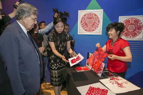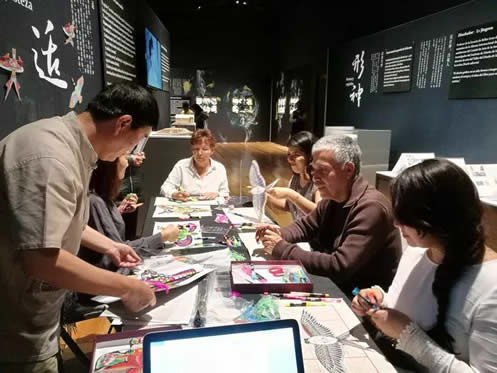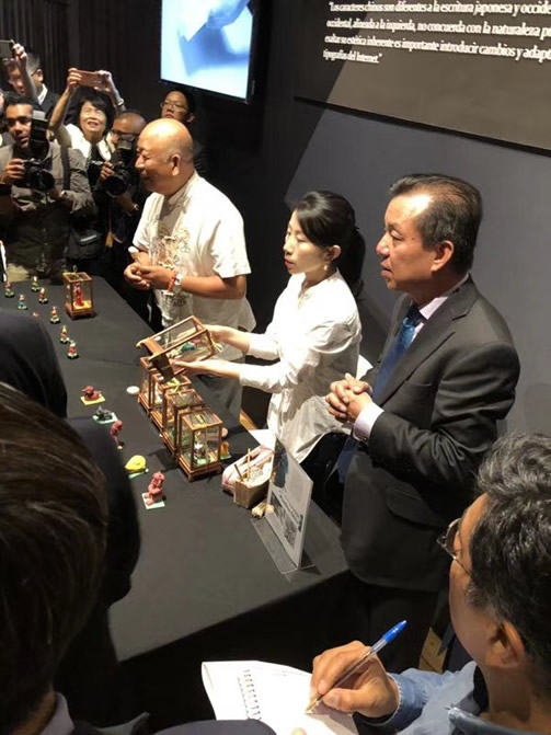 参观展览与艺术家互动作为文创周系列重要活动之一,来参观的墨西哥人民很多,他们认真阅读着展厅的文字简介、仔细观看着展览实物,他们对每一项来自中国民间的艺术都非常地感兴趣。风筝艺术家赵铁民的微型风筝上下飞舞,引来了许多民众顿足观看,老人、小孩、学生纷纷排队,等候在赵老师指导下得到一只属于自己亲手制作而又能飞上空中的风筝。北京书画艺术家,齐中和老师的展台前挤满了人群,齐老师用毛笔蘸着浓香的墨汁为每位参观者用汉字在书签上写着他们的寄语人名。面塑艺术家张俊显展台前早己座无虚席,围着的人很多,大家都想在老师的指导下学习尝试制作面人艺术,张老师手把手、一对一、面对面指导每一位观众亲自动手一会捏出个小章鱼、小鸭子,一会又捏出了个小企鹅、小熊……有些观众等不及了掏出钱就想购买,有的观众捏好后十分激动要给张老师小费,这些都被张老师一一拒绝了。当每一位观众塑好自己心爱的小动物时心情十分高兴,他们紧紧握着老师的双手,拿出手机拍照留下了这一美好的瞬间。剪纸艺术家张凤琴老师在展台前忙得不可开交,人们都想在她的指导下亲自学习实践一下剪纸艺术,自己剪出一张精美的剪纸。四位老师的展台前挤满了热情的观众,他们用墨西哥语《格拉西斯》谢谢来感谢各位大师,《欧拉》你好的欢声笑语不时在现场响起。