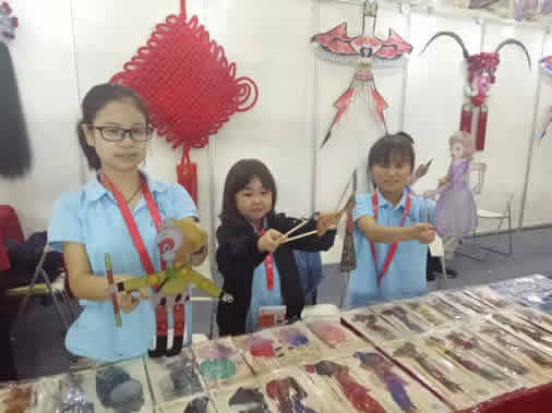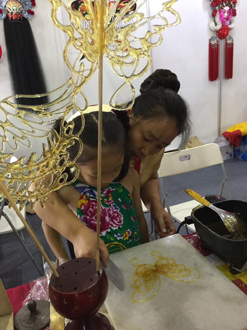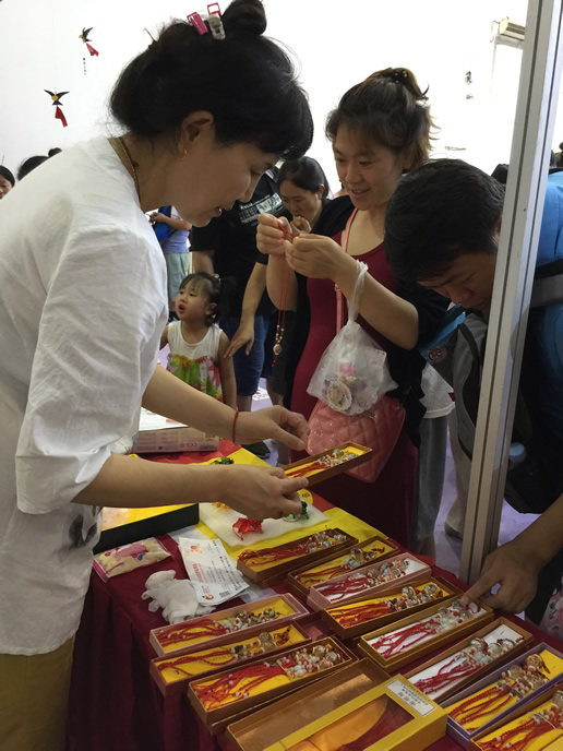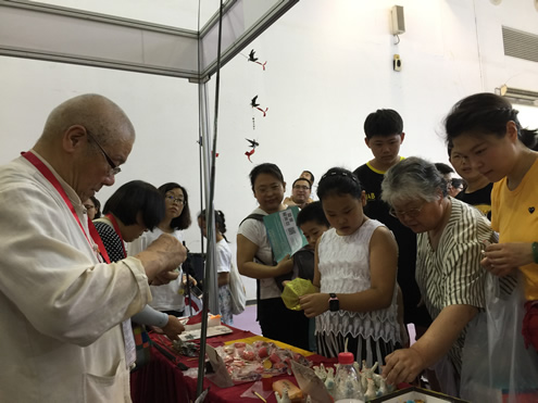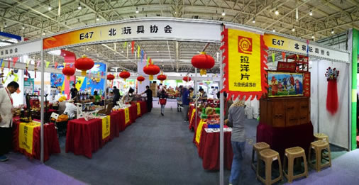应中国玩具和婴童用品协会邀请,北京玩具协会组织了面塑、泥塑、脸谱、太平燕、毛猴、风筝、编结、葫芦工艺、手工包、会动的书、吹糖人、糖画、益智玩具、万花筒、卵石画、内画、蜡果、蛋雕、鬃人、玲珑枕、皮影、拉洋片等20多个门类,四十多位民间玩具工艺大师现场献艺、展示绝活。近百米的展览场地,不一样的风采有别于整个展馆电子、科技、现代化元素高大上的布局,传统、民族、大气的大型京剧脸谱、构图精巧的风筝、红艳艳的中国结、高高悬挂的灯笼、空中飞舞的彩旗……独具特色的装点,醒目别致,是整个展会一道靓丽的风景。