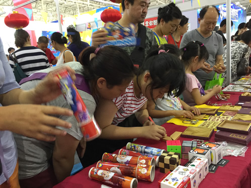本届玩博会不仅是儿童的乐园,也受到众多家长的喜爱。很多热情的观众纷纷围拢在面塑艺术家张俊显大师那里,目不转睛、顿足观看,有兴致的观众还非要加张老师微信进行拜师求艺。开发智力、启迪思维的拓扑环、七巧板、华容道、九连环、魔术圈、魔方等,同样吸引着一拨又一拨的益智玩具爱好者动手研究。体现原生态玩具的太平燕、吉祥鼓,每年都是小朋友的最爱,王文运老师一个人忙不过来,干脆叫来老伴帮忙助阵。首度登场的拉洋片成为四天活动的明星亮点,只见许崇有老师手打锣鼓、口唱西游记故事通天河,很多小朋友都争相观看。