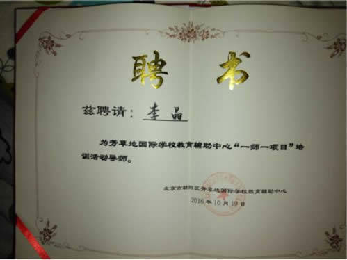 六年的非遗进校园生活(曾担任北京第二实验小学任职外聘教师, 现为北京芳草地教育辅助中心外聘教师),为了能够让非遗真正走进校园,让孩子体验自己动手制作一只能放飞的风筝,真正体验老北京风筝的艺术,他努力奉献,得到了广大师生的好评。他的两名学生徐羽鸿和孙楚越(北京第二实验小学的学生)用在风筝课上教授的技艺在2016年西城区第三届七彩梦想学生艺术节非遗项目组分别荣获一等奖和三等奖。