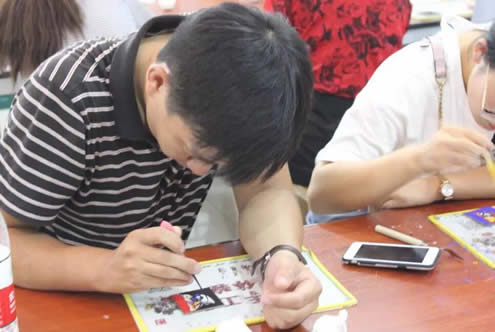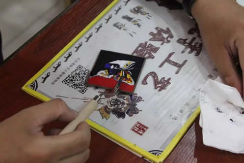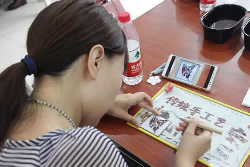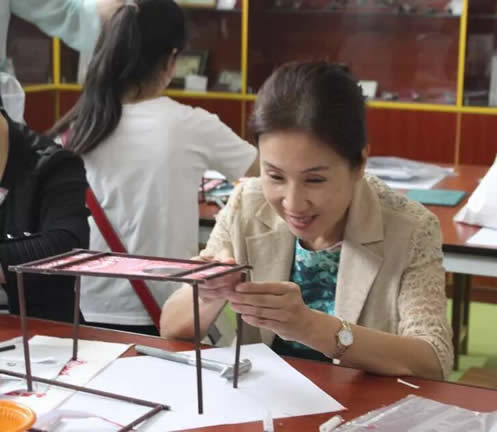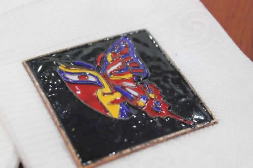 珐琅工艺是一种铜与火结合的艺术,在博物馆讲师的指导下,教师们用吸管将不同颜色的珐琅釉填入铜丝的空隙之中,大家认真上色,一丝不苟。上好色后,工作人员把铜胎放置在约800摄氏度的高温中烧制,烧制需经过两次,第一次烧制后,教师仍有机会为不甚满意的地方进行补色,第二次烧制后,作品则出炉定型。不少教师在拿到自己的“大作”后纷纷感慨:“原来釉料是这样被填充进去的。”“点蓝需要耐心,更需要静下心来,好的作品就是在反复烧制和填补釉料中诞生的。”