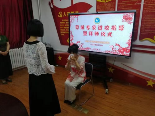 大家首先观看了各班学生剪纸和学校剪纸校园文化及剪纸展室。紧接着举行了收徒仪式:汇报学校剪纸发展历程;观看剪纸宣传片《非遗润人生,体验蕴特色》;介绍师父张凤琴艺术简历;两位徒弟分别进行自我艺术学习简历;宣读拜师贴,敬茶,感谢师父传道授业解惑、并表示在教育岗位上尽职尽责、刻苦钻研、奋发进取,弘扬剪纸艺术;回师贴……;北京玩具协会领导宣读收徒见证声明并向张凤琴颁发了“传艺授业”证书。