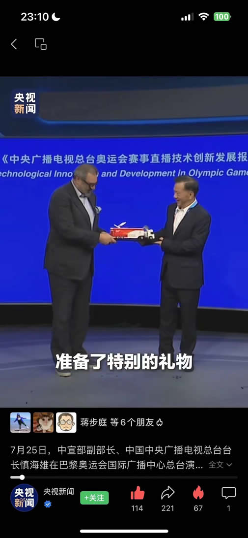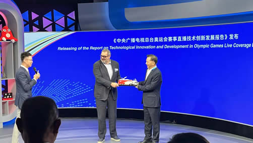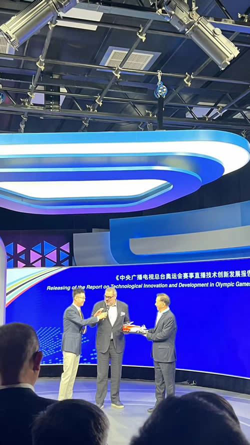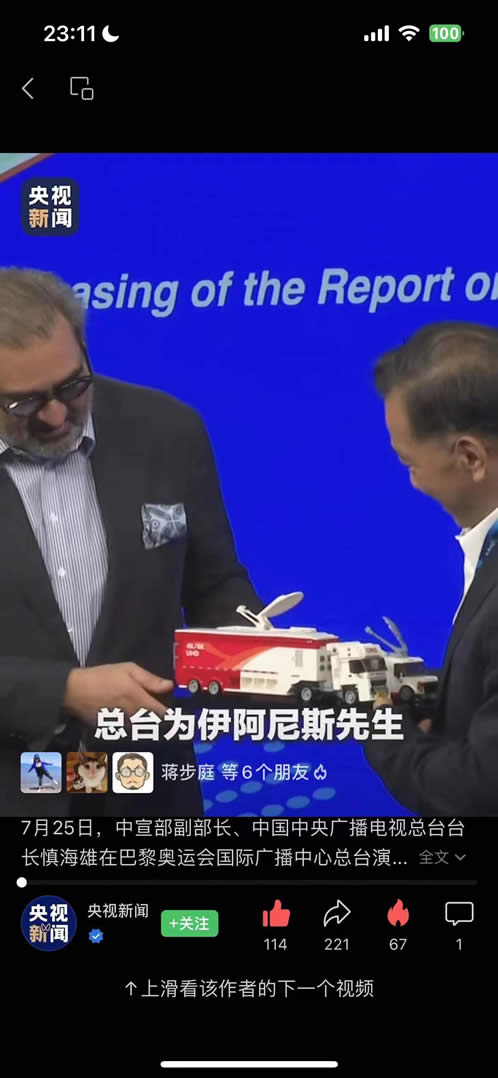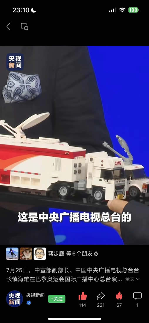 北京玩具协会会员单位北京闲庭信步文化艺术有限公司用塑料拼插颗粒积木制作完成的央视总台8K转播车模型,7月25日,由中宣部副部长、中国中央广播电视总台台长慎海雄在巴黎奥运会国际广播中心总台演播室向奥林匹克转播服务公司首席执行官伊阿尼斯·埃克萨科斯作为礼物赠送。